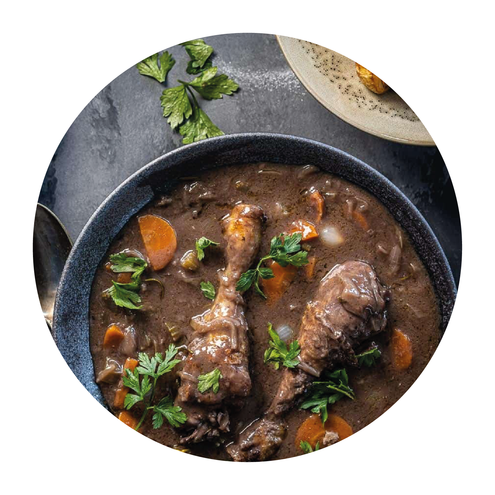 Coq au vin oftewel 'haan in wijn', twee woorden waarvan de meesten beginnen te watertanden. Dit gerecht, waarbij de haan wordt gestoofd in een grote pan met rode wijn, is een Franse klassieker en super leuk om een keer te maken. Tegenwoordig gebruikt men hiervoor kip in plaats van een oude, uitgerangeerde haan. Dit geeft een kruidige, aardse en volle smaak van het gerecht. Voor dit gerecht is het eigenlijk simpel: drink dezelfde wijn als die je gebruikt voor de bereiding van het gerecht. Onze tip? Een Pinot Noir, Grenache of Cinsault doen het super! Oorspronkelijk komt het gerecht uit de Bourgogne dus wordt een Pinot Noir uit deze streek het meeste gebruikt.